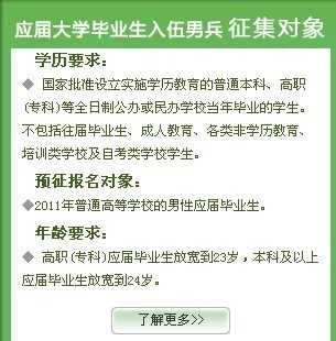 2011届应届毕业生预征报名图示 来源: 作者: 发布时间:2016-02-27 09:31:13 浏览次数: 次 【字体:小 大】 一、预征报名网址: 二、男兵征集对象要求: 三、应届毕业生入伍优惠政策: 四、应届毕业生入伍流程 分享到: 【打印正文】