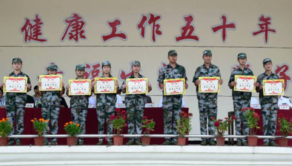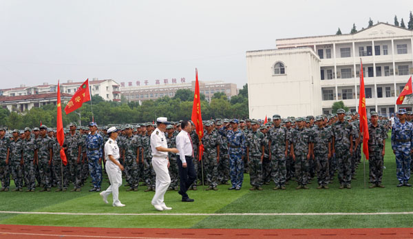 姜安心在马陆军、王同庆的陪同下检阅军训连队