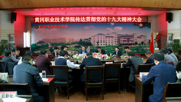 东风浩荡花千树,骏马扬蹄声万里。中国共产党第十九次全国代表大会胜利闭幕,10月27日上午,黄冈市委召开了学习贯彻党的十九大精神会议。下午,在中心会议室,学校传达了市委学习十九大会议精神。学校全体例会人员,各教学学院党总支副书记,民主党派和无党派人士,纪委办、组织部、宣传部、马克思主义学院全体人员参加大会。党委委员、 工会主席、宣传部长郑柏松主持大会。