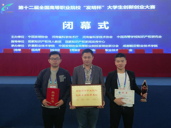 10月25至27日,taptap点点机电学院工业设计专业主任王治雄带领金鹰3D团队高洪、戴思诚同学,在河南省许昌职业技术学院参加了第十二届全国高等职业院校“发明杯”大学生创新创业大赛总决赛,荣获全国一等奖、二等奖各1项,王治雄老师被评为“优秀指导教师”,同时,taptap点点被授予全国高等职业院校创新发明教育基地(全国仅10所)。