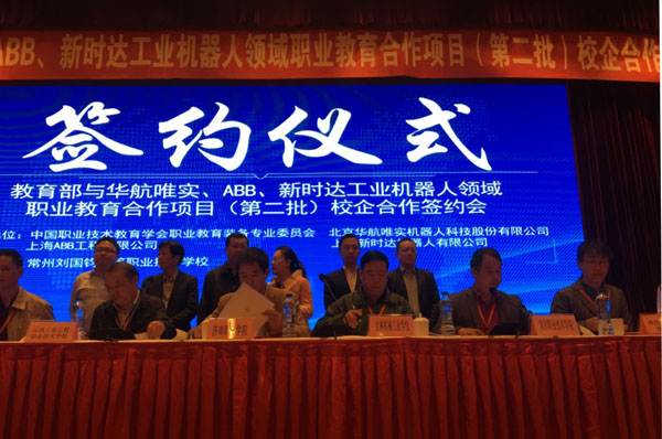 11月6日,教育部与华航唯实、ABB、新时达工业机器人领域职业教育合作项目校企合作签约会在常州举行,来自全国的48所职业院校作为第二批签约合作院校与华航唯实、ABB、新时达签订了校企合作协议。