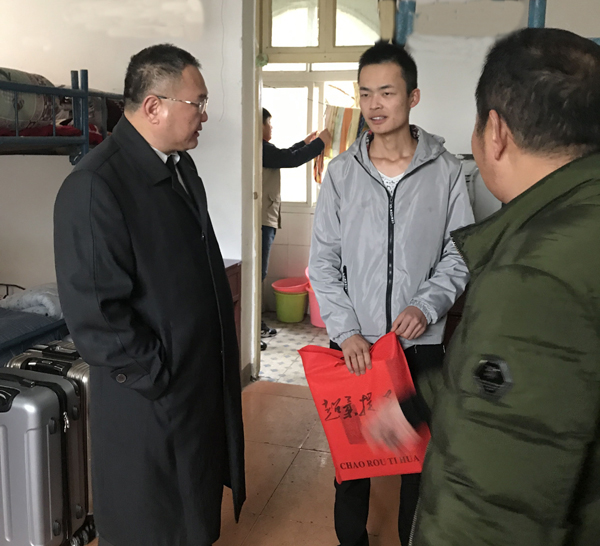 姜安心先后到22栋A、51栋等学生宿舍给旅游201701班胡伟等家庭经济困难学生送去了厚实的保暖内衣,并与同学们亲切交谈。他详细询问了同学们的生活和学习情况,细心查看了同学们的住宿环境,对贫困学子嘘寒问暖。鼓励他们要以积极乐观的心态面对生活中的困难,发扬艰苦奋斗的精神,努力学习专业知识,立志成才,报效祖国。