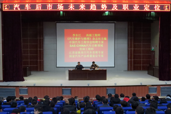 李东江以渊博的知识、独到的见解以及幽默的语言赢得了全体师生的阵阵掌声。他通过大量的数据和案例分析了汽车行业未来的发展趋势,并断定新能源汽车将会有很大的发展空间,特别是在未来的几十年内,将会形成新能源汽车与传统汽车并存的局面,因此,社会将会需要更多的汽车人才。他希望同学们从现在开始要做好职业规划和定位,树立信心,在学好传统汽车维修技能的同时,要“择一行、爱一行、专一行、精一行”。另外,还要不断地培养“洞察力、思考力、决策力、执行力、学习力”五个方面的能力,努力地发掘自己的潜能,认真钻研一门专项维修技能,把握汽车行业发展的机遇,顺势而上,按照国家大力发展职业教育的方针和政策,大胆地开展创新和创业。