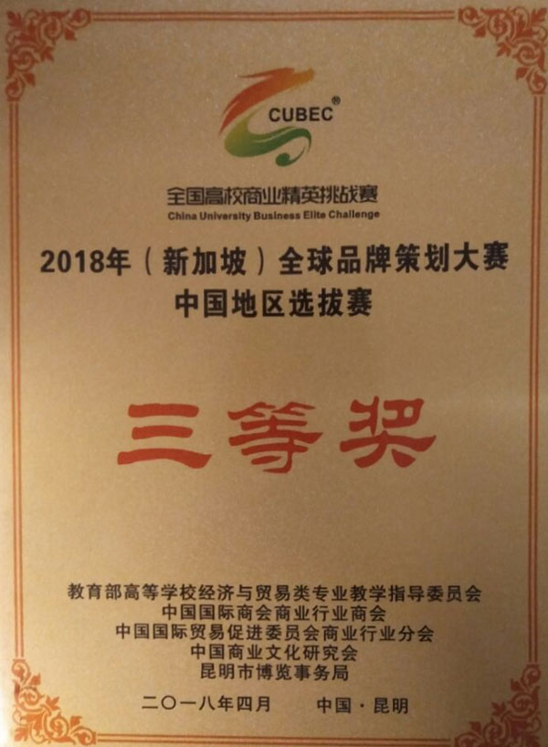 2018年4月23日-4月25日,由教育部高等学校经济与贸易类专业教学指导委员会、全球华人营销联盟、中国贸促会商业行业分会和新加坡营销协会共同举办的2018年(新加坡)全球品牌策划大赛中国地区总决赛在云南昆明举行。此次大赛共有来自全国23个省市、自治区、直辖市的130所高等院校的258支队伍(本科172队、专科86队)、1000多名大学生同台竞技。经过紧张激烈的角逐,taptap点点市场营销专业2支代表队的作品“阿米子品牌策划方案”及“湖北恩施润邦富硒茶品牌策划方案”双双荣获三等奖。