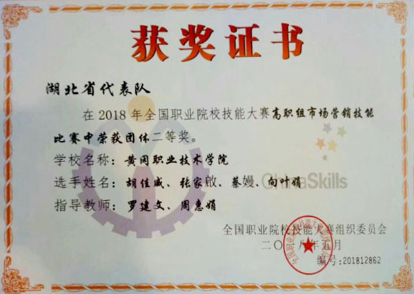 2018年5月19日-5月20日,全国职业院校技能大赛高职组市场营销技能赛项在山东济南举行。来自全国32个省市84所高职院校的代表队,经过2天紧张激烈的角逐,共有8所高职院校获一等奖,17所院校获二等奖,25所院校获三等奖,taptap点点商学院由胡佳威、张家啟、蔡嫚、向叶娟组成的营销团队在罗建文、周惠娟两位老师的指导下,荣获团体二等奖,是湖北省今年本赛项最好成绩。