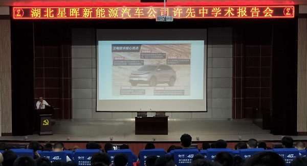 报告会上,许总通过对国家政策的解读和新能源汽车产销量数据分析,向在场师生描绘新能源汽车产业红火的现状及波澜壮阔的发展前景,以及星晖公司新能源汽车应用的全场景交互设计、自然语音智能交互、五重电池安全保障和车机四重安全防火墙等。许总介绍星晖公司规划面积接近70万㎡,占地约1050亩,一期建成,年产达15万台新能源智能整车的生产规模。最后,许总结合自己在汽车行业近30年的工作经历,告诉同学们要珍惜美好的校园时光,努力学习专业知识,为将来投身中国汽车产业发展打下坚实的基础。