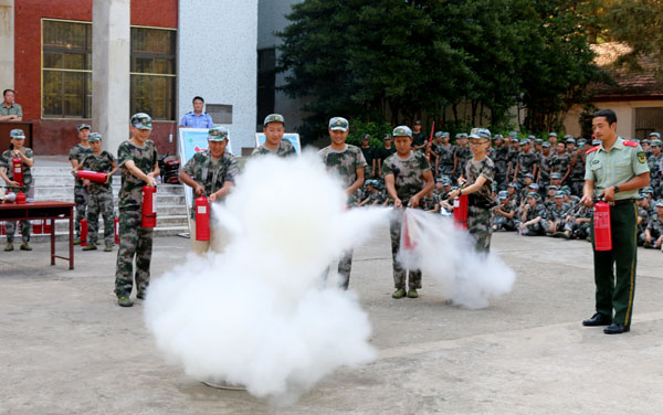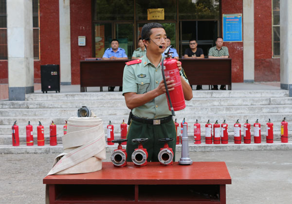 为增强taptap点点2018级新生的消防安全意识,掌握消防灭火器、消防水带等消防工具的使用方法,提高抵御火灾和应对突发事件的能力,9月19日下午15时,保卫处、学工处联合黄冈市消防支队举行“消防知识进军训”活动。黄冈市消防支队特勤中队中队长陈猛、保卫处处长邓国璋、学工处副处长崔现强、保卫处副处长魏鹏、劳动实践科科长朱卫东及2018级1000余名军训新生代表参加了本次演练活动。演练活动由魏鹏主持。