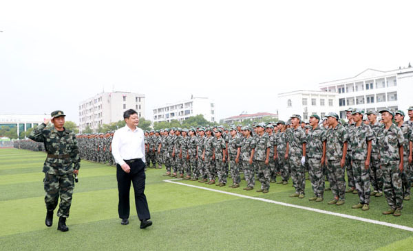 张新佳在王小彬的陪同下检阅军训连队