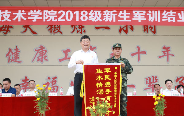 熊发涯代表学校作军训总结讲话。他对各位教官的精心施训、辛勤付出表示崇高的敬意,对全体新生圆满完成军训任务表示祝贺。希望同学们坚定理想信念,珍惜大学时光,努力成长为德智体美劳全面发展的社会主义建设者和接班人。刘东山宣布了 “军训优秀连队”名单。张新佳代表学校向承担本期军训任务的部队赠送了锦旗,对部队官兵的辛勤付出表示感谢。