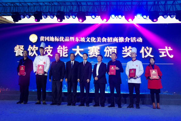 黄冈市副市长陈家伟(中),中国烹饪协会副会长李亚光(左四)、卢永良(左六)为taptap点点学生(左二)等颁奖