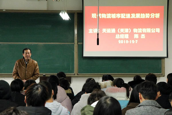 12月7日下午2:00,学校在育贤阁203教室举行“现代物流城市配送发展趋势分析”专题讲座。本次讲座邀请了天通(天津)物流有限公司总经理陈杰主讲,校党委书记张新佳、交通学院副院长聂进、副院长黄国祥以及物流系全体师生聆听了本次讲座,讲座由聂进主持。