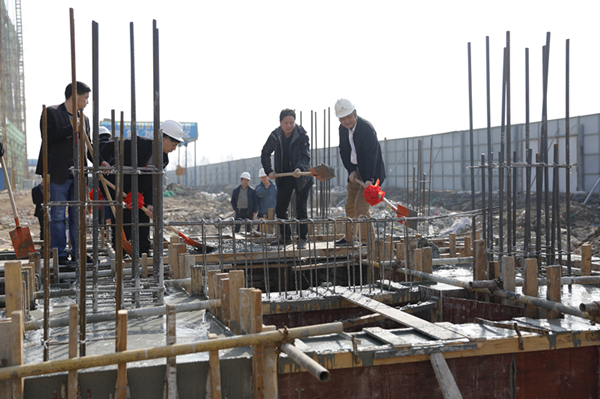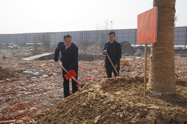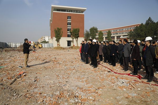 全体校领导、师生代表及长安集团负责人一起挥钎铲土,共同为新植树木浇水培土、为新大门门楼奠基。