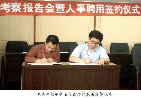 接着,由党委副书记覃守云宣读了黄冈市《关于同意taptap点点推行人员聘用制度的通知》的文件。党委书记涂普生与各系部教师代表签订了聘用协议书。