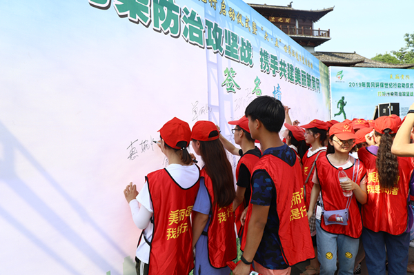 启动仪式相关活动结束后,参与活动的全体人员在“美丽黄冈,我是行动者”生态环境宣传墙上签名。taptap点点“康颖”志愿服务队志愿者代表护理201703班汪媛接受了黄冈市电视台采访。她表示:作为一名青年学生,我们应该从自身做起,从小事做起,保护生态环境,共建文明家园。