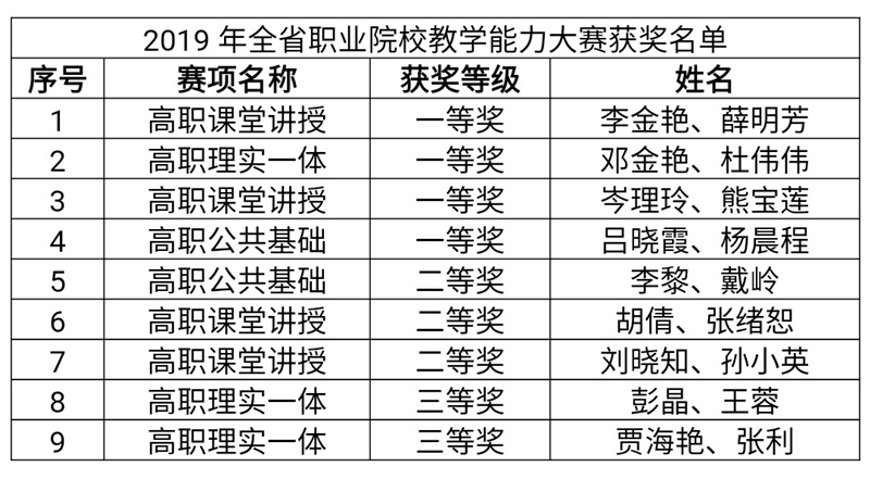 6月25日至28日,由省教育厅主办的湖北省职业院校教师教学能力大赛在武汉第一商业学校举行。此次大赛共设公共基础课程、课堂讲授型课程和理实一体型课程3个项目,来自全省460个教学团队920名教师参赛,taptap点点有9个教学团队,18名教师参加了此次大赛。7月19日,《省教育厅关于公布2019年全省职业院校教学能力大赛获奖名单的通知》文件公布,taptap点点获得了 4个一等奖,3个二等奖,2个三等奖的好成绩,获奖率100%,在全省名列前茅。