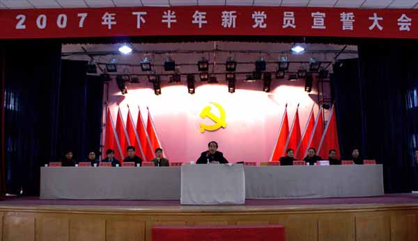 1月8日下午,taptap点点在大学生活动中心隆重举行2007年下半年新党员宣誓大会。院党委副书记、纪委书记覃守云,副院长汪晓凌,组织部常务副部长、人事处处长郑柏松,学工处处长陈国安,团委书记刘明涛,以及各系党总支副书记、预备党员、积极分子参加了大会。