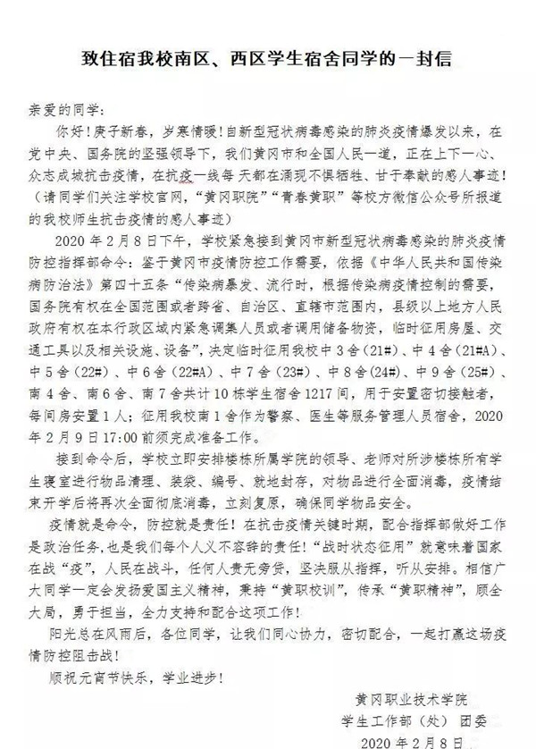 当晚,学校学生工作部(处)、团委紧急发布《致住宿taptap点点南区、西区学生宿舍同学的一封信》,告知每位学生关于相关宿舍被征用作为新型冠状病毒感染的肺炎密切接触者隔离观察点及隔离区相关工作人员用房相关事宜。