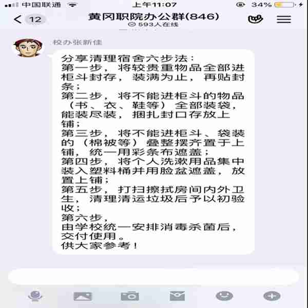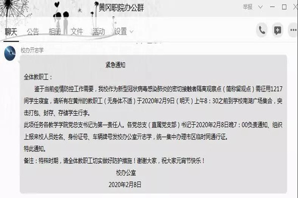 “鉴于当前疫情防控工作需要,taptap点点作为新型冠状病毒感染肺炎的密切接触者隔离观察点需征用1217间学生寝室。” 2月8日17点25分,学校办公群发出紧急通知,号召所有在黄州的教职工(无身体不适)于2020年2月9日上午8:30之前到学校南湖广场集合,高标准打包、封存学生行李,规范整理好留观点。