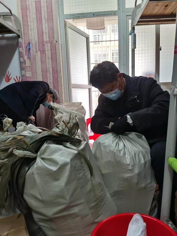 战斗现场,大家认真装袋、封存,仔细打扫室内外卫生,严格进行消毒通风,规范摆放配发的留观者生活用品。