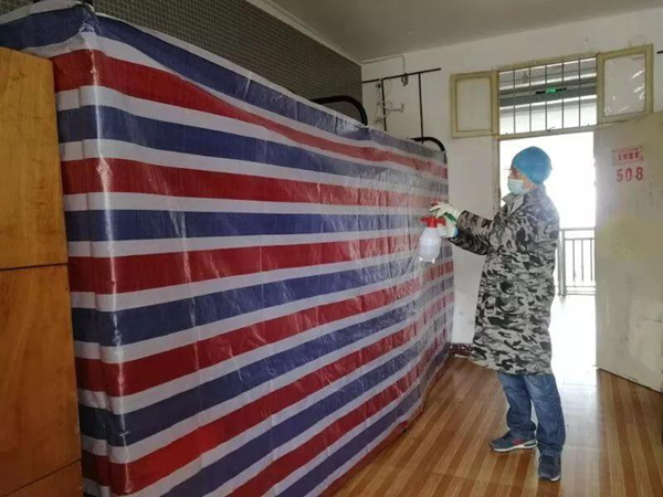 物品存放区以彩条布包裹,老师在进行室内消毒杀菌