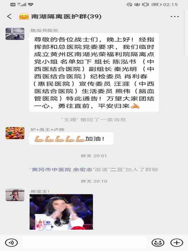 昨天收住了三名特殊病人:一位爸爸带着一个4岁的孩子和一个9个月大的孩子。孩子们的外婆已感染去逝,妈妈和外公已确诊隔离,此3人等待检测结果。今天上午9个月大的小孩和爸爸因确诊被转入大别山医疗中心,4岁的小男孩检测结果为阴性,留隔离区继续观察。医护人员悉心照顾小孩,爱心人士纷纷捐献儿童衣服、玩具、书籍等。以往最忙的小夜班,今天总算稍有缓解,重点处治了2名较重症病人,其它以安抚病人情绪为主。晚上南湖隔离病区成立临时党小组,由我担任纪检委员,班上提及此事,护士段水容、刘潇潇、何和当场提出一线入党请求,并递交入党申请书,护士郑方和鲍淦随后也递交入党申请书,此情况已及时向程朝晖书记和组织部进行了汇报。