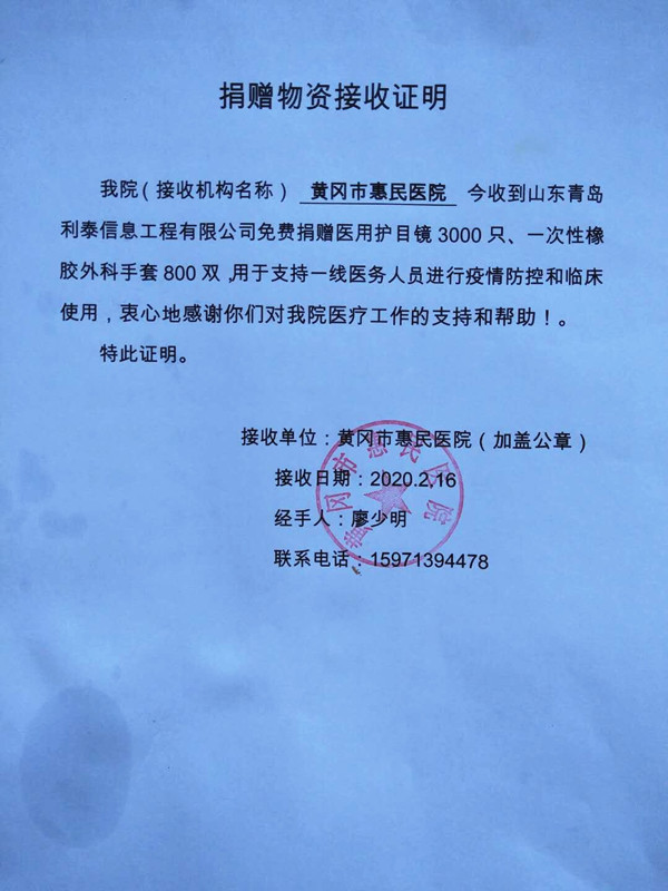隔离病毒,但不隔离真情。封锁城市,但不封锁真心。在得知taptap点点惠民医院作为黄冈市新型冠状病毒肺炎隔离治疗定点医院紧缺大量医疗用品后, taptap点点商学院会计电算化200104班毕业生李明第一时间与其辅导员段悦兰老师联系了解疫情,慷慨解囊,以青岛利泰信息工程有限公司的名义采购了价值20万元的宝贵医用物资,向惠民医院捐赠医用护目镜3000个,医用橡胶手套800双,以感恩之心、实际行动诠释着“读一所大学,爱一座城市”的深深母校情。“李明在校期间就是优秀学生的典型代表,她总能带头让身边事教育身边人,让身边人感动身边人”,段悦兰老师如是说。