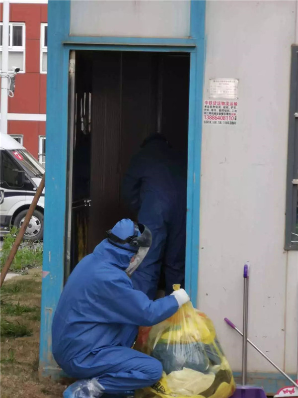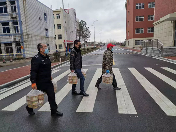 物资保供组崔现强、校园安保组鲍才和、保洁消杀组王华清给留观人员送餐