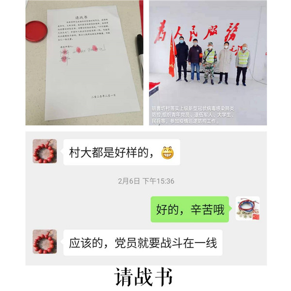 自新型冠状病毒肺炎疫情爆发以来,胡曹坊村志愿者群里每天都有人自告奋勇,响应勇做“逆行者”,积极参与到疫情防控工作中,对进出村的车辆、人员进行排查登记,在村内巡逻宣传防控政策知识,为疫情防控贡献力量。