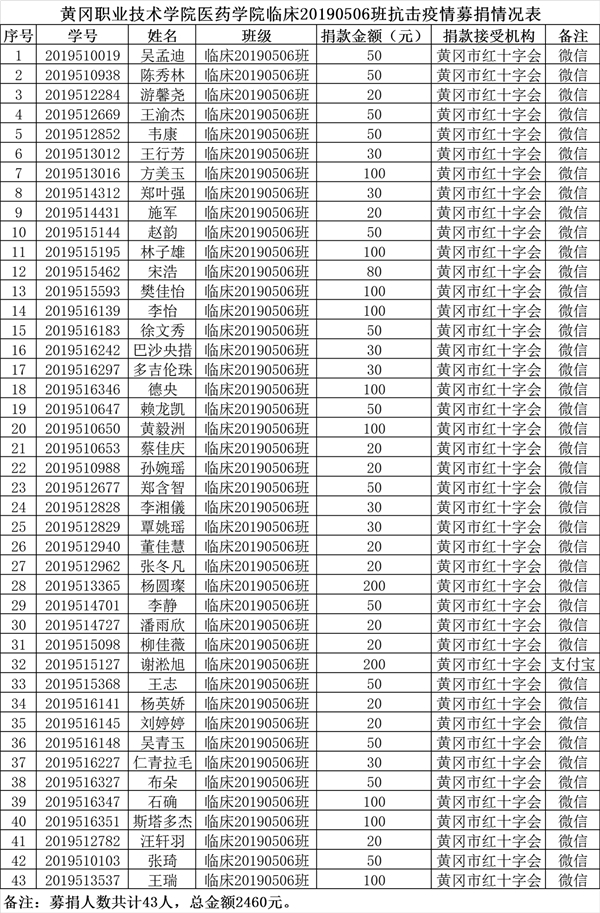 于是2月8日,班干部提出倡议并组织同学们积极为灾区捐款,采取自愿原则进行。同学们的每一笔捐款都在班级群内公示,许多同学都积极献出爱心10元、20元、50元,甚至100元、200元,捐款金额共计2460元。募捐结束后班级负责人第一时间将其交给黄冈市红十字会,用于黄冈中心医院新冠肺炎防疫工作。