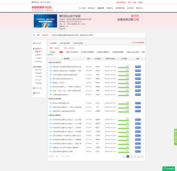 据悉,本次培训将历时39天,设计了“课程学习、主题研讨、直播答疑、心得撰写”四个环节。培训课程分为录播课程和直播课程,录播课程内容涵盖“价值引领与思想引导”“生涯规划与就业指导”“学业指导与班级管理”“心理调适与健康维护”“日常事务教育管理”“疫情防控知识”六大模块,共六十余门课程;直播课程开设了四场“疫情”相关主题的直播讲座,全面系统地为辅导员开展培训。