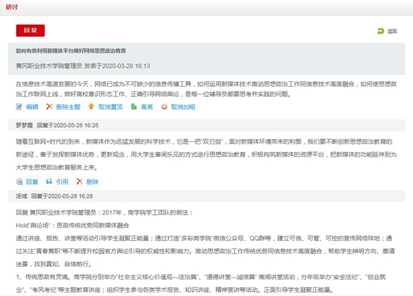 培训期间,在学生工作部(处)、团委和各教学学院的统一安排和精心组织下,全体学工人员通过手机(学习公社APP)、电脑端等按时观看、学习录播课程,及时记录重点要点;准时收看直播讲座,线上与思政教授专家共同探讨、交流在疫情期间以及日常工作中遇到的各类问题;围绕“如何做好疫情期间青年学生的思想政治工作”“如何对当代青年学生进行爱国主义教育”“如何有效利用新媒体平台做好网络思想政治教育”等主题进行线上集中研讨,碰撞思维的火花,分享思想政治工作的经验和做法,巩固学习成效;结合学习所得与岗位工作实际,撰写学生思想政治工作案例,运用理论知识分析问题产生的原因,并提出解决问题的方法与策略,促进所学知识向能力的转化。