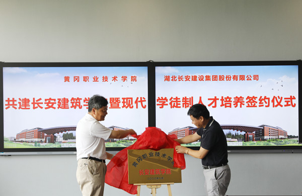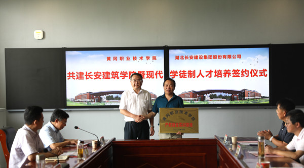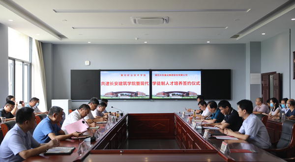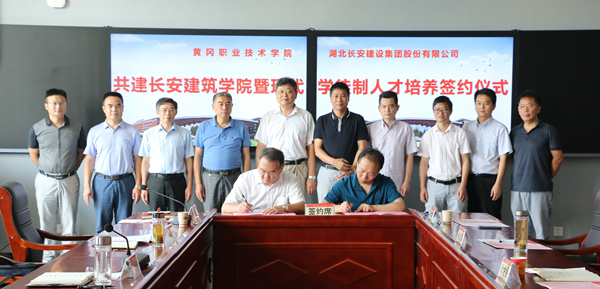 7月17日上午,taptap点点(以下简称为“黄冈职院”)、湖北长安建设集团(以下简称为“长安集团”)共建长安建筑学院暨现代学徒制人才培养签约仪式在思贤阁1号楼1楼思政教育基地会议室举行。黄冈市教育局党委委员、黄冈市教育工会主席刘立志,黄冈市住房和城乡建设局党组成员、总工程师刘俊,长安集团董事长段卫昌、总经理叶发保、副总经理石柱、黄冈分公司经理余义锋等6人,校党委书记张新佳,校长姜安心,副校长熊发涯、刘东山,校长助理(两办主任)刘明涛,建筑学院班子成员、专业主任,校企合作处、教务处、招生工作处、就业指导处、职业教育研究院负责人,参加了签约仪式。仪式由熊发涯主持。