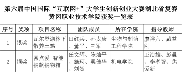 近日,湖北省教育厅发布了《关于公布第六届中国国际“互联网+”大学生创新创业大赛湖北省复赛获奖名单的通知》,学校推荐的“瓦尔登湖林下散养土鸡”项目荣获省赛银奖,“易点爱-智能捐款捐物箱”荣获省赛铜奖。