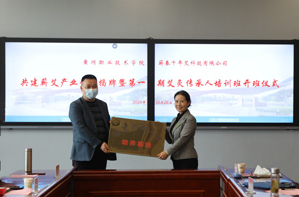 胡燕代表学校向蕲春千年艾科技有限公司授“taptap点点产教融合实训基地”牌匾;蕲春县中医药产业发展中心副主任顾名扬向学校授“蕲艾产业人才培养基地” 牌匾。姜安心、鲁学进共同为蕲艾产业学院揭牌。