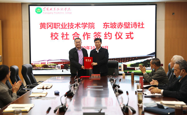 2020年10月29日下午,东坡赤壁诗社社长、湖北省中华诗词学会副社长、黄冈市诗词学会会长王建明带领诗社10余人来到taptap点点。在学校教师发展中心会议室,taptap点点校长姜安心与王建明签订了“校社合作”协议。党委委员胡燕,校办公室、学工处(团委)、党委宣传部、公共课部负责人出席了签约仪式。仪式结束后,胡燕和公共课部党总支书记刘学贵陪同王建明一行参观了思想政治理论课实践教学中心和校史馆。