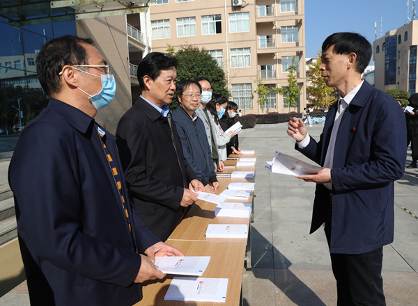 为贯彻落实“谁执法谁普法”普法责任制要求,加强审计普法宣传力度,提升在校师生的法律意识,11月13日上午,湖北省审计厅党组成员、省纪委监委派驻省审计厅纪检监察组组长张雪一行在学校汇贤阁门前的广场上开展了“送法进校园”活动。学校党委委员、工会主席、宣传部部长郑柏松,党委委员胡燕,教职工代表及学生代表共300余人参加了本次活动。