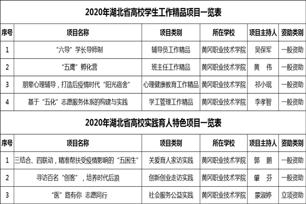 据悉,该项目自启动以来,经各高校推荐申报、专家评审、相关项目重复性审查和网上公示等环节,评选出拟立项的2020年湖北省高校学生工作精品项目(共173项,其中:重大资助6项,重点资助28项,一般资助113项,立项资助26项)、2020年湖北省高校实践育人特色项目(共107项,其中:重大资助5项,重点资助10项,一般资助80项,立项资助12项)。