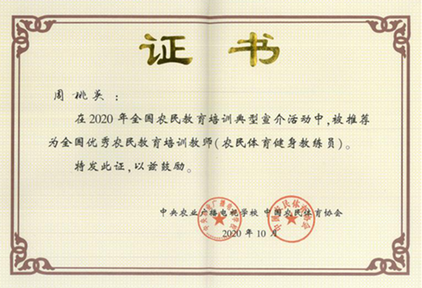 为全面提升农民教育培训质量效果,在农业农村部科技教育司指导下,中央农业广播电视学校组织开展了2020年全国农民教育培训四大典型宣介活动,遴选全国农民教育培训百名农民教育培训优秀学员、百名优秀农民教育培训教师、百个农民培训优秀田间学校、五十个发展典型案例,taptap点点《“334”农民职业培训案例》入选发展典型案例,周桃英教授入选全国百名农民教育培训优秀教师。