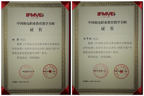 另外,在刚结束的第三届中德机电一体化职业教育国际论坛暨第四届全国机电一体化专业教学经验交流会(2021)论文征集评选中,经主办单位组织专家对参评论文进行严格、认真评审,马中秋老师撰写的《基于“五维”智能制造专业群建设质量评价体系研究》论文荣获二等奖,杨芳老师撰写的《线上线下混合式教学,践行大国工匠精神——以可编程控制器应用技术课程为例》论文荣获三等奖。