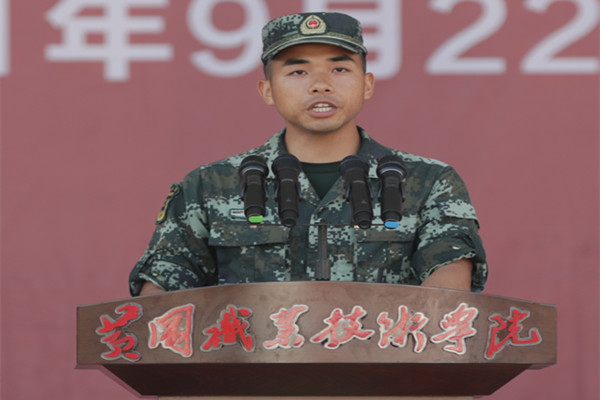 商学院酒店管理202101班闻樟代表参训新生发言并作出郑重承诺,提高思想站位,增强国防意识,坚决服从管理,以军人的标准从严要求自己。