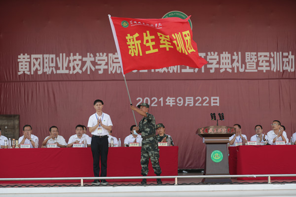 动员大会上,郑柏松向李春奉授taptap点点新生军训团旗。师生共同观看了军训教官训练汇报演示。