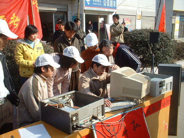 5日上午8:00,在学院成功大道上,迎风飘起了一面又一面“青年志愿者”的旗帜,那是各系青年志愿者代表队在建立他们的“小阵地”。最最引人注目的还是计科系的计算机协会,他们设立了三个义务点:电脑模拟配机、电脑知识咨询和电脑故障排除。上午9:00,院党委涂普生书记、覃守云副书记亲临活动现场,还分别对各系社团送去了学院对它们的关怀,对此次“学习雷锋精神”义务活动的开展表示充分的肯定,并希望他们继续学习和弘扬雷锋同志为人民服务的钉子精神。