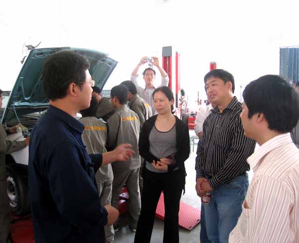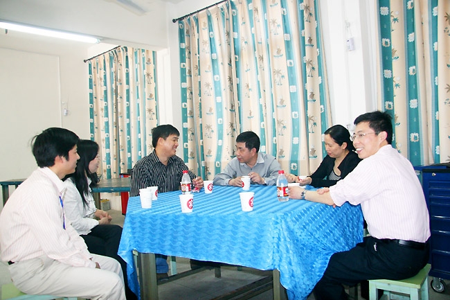 从汽车实训基地主车间出来后,考虑到参观时间已经很久,张书记建议安排休息一会儿,交通工程系同志在板金实训室用两张实训桌拼在一起,组成一个“会议桌”,院办公室同志倒上茶水,林处长、张处长、张书记、熊教授、柳遂文处长、刘学贵书记、张红英主任、曾鑫主任围在一起,林处长利用这一机会,开起了一个座谈会,大家对示范院校建设、校企合作、课程体系、师资队伍建设和实训基地建设等内容进行了深入广泛的交谈。张书记希望在示范院校建设中应该考虑欠发达地区学校的示范作用,他们在硬件上不能与发达地区相比,但他们好的作法更加具有示范性,因为发达地区的硬件条件,别人学不了;实训基地的建设也是这样,150万对发达地区的学校不算什么,最多只是锦上添花,而对于欠发达地区来说,可以说是雪中送炭,希望教育部加大对贫困地区的支持力度。院长助理熊发涯反映在课程体系构建中,教育部推行的基于工作过程的学习领域课程体系是件好事,但每个学校都要进行从专业调研、行动领域分析、典型工作任务归纳到学习领域开发整个过程,各学校做出的结果差异很大,同一专业在全国的课程设置体系几乎完全不同,有的学校因为理念方法不到位,也可能走样,希望教育部组织起来,形成全国可参考的课程标准,形成标准课部分+地方特色课部分的课程体系参考,另外,教高16号文件中指出要制定高职院校教师的任职资格标准,特别是双师型教师的标准,希望尽快出台。林处长表示可以理解,教育部也会逐步解决这些问题。林处长对实训基地的建设进行了解:一是汽车实训基地300万是多了,还是少了,要多少才合适;二是设备采购方面,是自主采购好,还是集中采购好,要不要出台参考配置。张主任、曾主任根据taptap点点的实际情况回答了林处长的问题。林处长还对学生可持续发展问题、学生就业问题、办学水平评估问题、双证书问题与座谈者交换了意见,他强调,要正确处理好高职与中职的区别,高职不仅要培养学生的动手能力,还要注意培养学生的可持续发展能力。