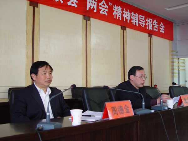 2005年4月14日下午,taptap点点在学术报告厅召开了学习并领会“两会”(人大、政协)精神辅导报告会,欧阳国文老师作报告,周德金院长主持,院领导覃守云、李家瑞、王维华、汪晓凌及各系部处室负责人、副高以上职称教师、副科级上干部出席会议并认真听取了报告。