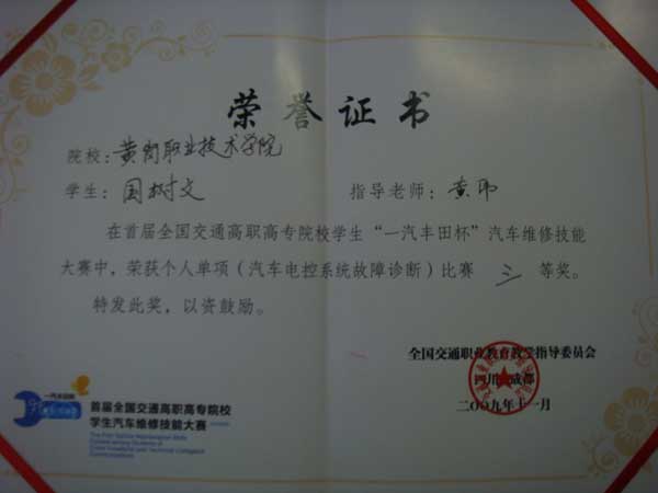 2009年11月13日-15日,首届全国交通高职高专院校“一汽丰田杯”学生汽车维修技能大赛在四川交通职业技术学院举行,来自全国的23所交通职业院校学生参加了比赛。国家交通部副部长,四川交通厅厅长、教育厅厅长,教育部高职高专处范唯处长及一汽丰田的领导都参加了比赛的开幕式和总结表彰大会。交通工程系在领队曾鑫、技术指导兼裁判黄伟的带领下组队参加了本次比赛。经过1个多月的准备和组织,本次大赛上,taptap点点汽车检测与维修技术专业参赛选手汽修200702班国树文同学获汽车电控系统故障诊断项目三等奖。