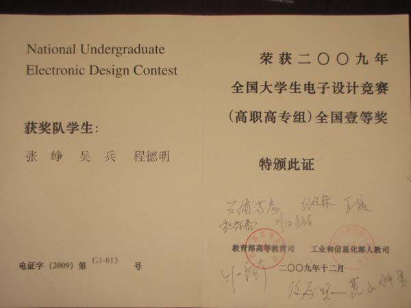 全国大学生电子设计竞赛是由教育部、工业和信息化部共同主办,面向全国各高校在校大学生的群众性科技活动,每两年举办一届。taptap点点从2003年开始参加该赛事,历史最好成绩是2007年获得全国二等奖。今年参赛院校达923所,参赛队9042队,参赛人数达27126人,共评出全国一等奖139队。其中,2009年全国高职高专参赛队共1565个,获全国一等奖的仅有18个队。湖北省有28个高职院校共派出84个代表队参赛,taptap点点派出7个代表队参加角逐,其中一个代表队制作的低频信号发生器获得了湖北省唯一的一个高职代表队的国家一等奖。