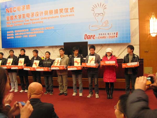 12月5日,由教育部、工业和信息化部联合主办的2009年全国第九届大学生电子设计大赛颁奖典礼在人民大会堂隆重举行。原全国政协副主席胡启立,教育部高教司副司长刘桔,工业与信息产业部党组成员、人教司司长陈小祝,全国大学生电子设计竞赛组委会主任、中国科学院、中国工程院院士王越,组委会副主任兼秘书长、北京理工大学副校长赵显利,NEC电子全球营业总裁三浦芳彦,NEC电子中国总经理竹山裕彦,以及来自全国29个赛区的各赛区教育厅主管领导、组委会、专家组代表、获奖单位和学生代表齐聚一堂参加了此次盛会。作为全国一等奖获得者单位代表之一,taptap点点机电工程系马中秋老师和全国一等奖获得者2007级应用电子专业学生吴斌参加了颁奖典礼。