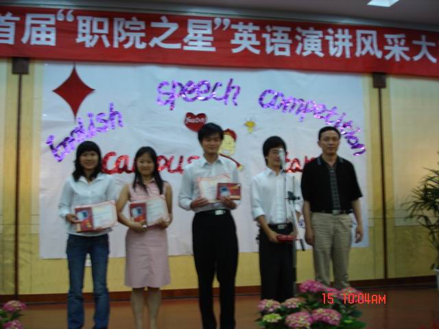 本届“职院之星”英语演讲风采大赛是由院教务处主办、基础课部协办、院英语协会承办的,比赛分为专业组和非专业组进行比赛。在各系先行组织了预赛和复赛后,共有26位选手进入了决赛。本届大赛的提问专家和评委由4位外教和英语教研室的十一位老师担任。在整个比赛中,选手们无论是在自由演讲环节还是在现场问答环节都表现了较高的水平。在经过近三个小时的比赛后,机电系、人文系、生物系代表队分获团体一、二、三名,马艾莉、金勇等四位同学成为当晚的“职院之星”。