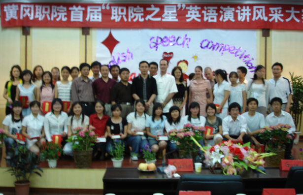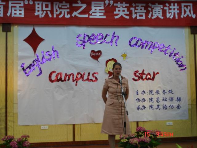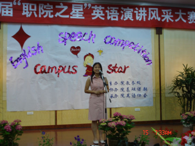 5月15日晚,taptap点点首届“职院之星”英语演讲风采大赛决赛在taptap点点学术报告厅隆重举行。副院长李家瑞同志应邀来到了比赛现场。院教务处李雪早、金为民两位处长、基础课部李卫光主任、各系团总支书记、学管主任以及四位外教Gary、Susan、Atticus和Kerry、英语教研室的十一位老师、院英语协会的成员、各社团的代表以及各系学生代表约200多人共同参加了本次活动。