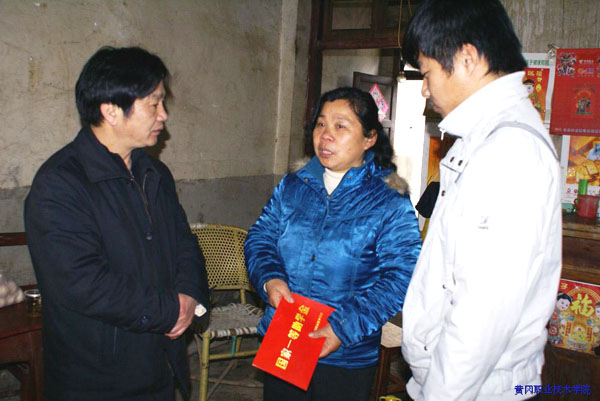 2009年1月30日上午10时,学院副院长汪晓凌带领水电交通系、学生工作处等部门6人到黄州区龙王山社区,走访看望水电交通系经济困难学生、国家一等助学金获得者杨攀同学及家人。